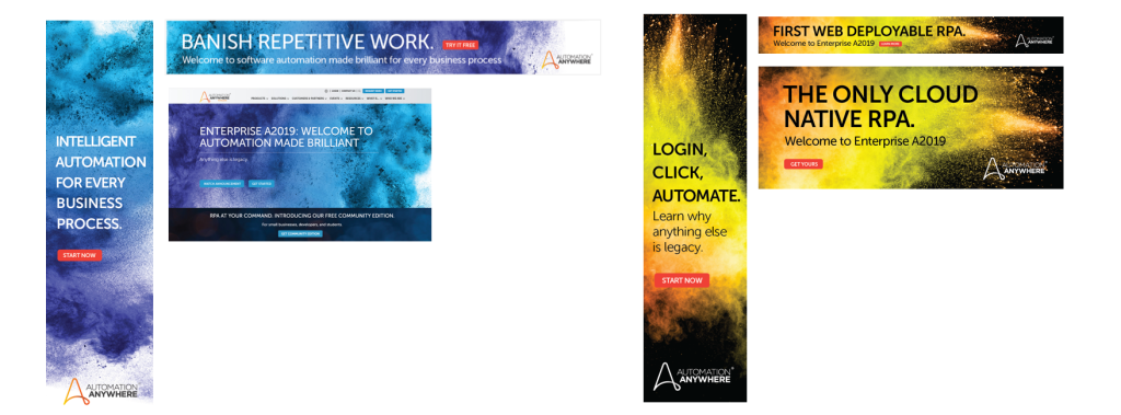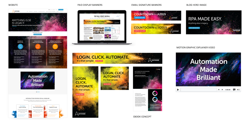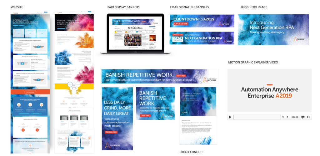 On October 4, 2019, Automation Anywhere proudly launched Enterprise A2019 at Nasdaq in Times Square. The event, streamed live globally, attracted customers, partners, press, analysts, influencers, and excited Automation Anywhere employees. I oversaw the visual design for the pre-event, live-stream, and post-event phases, including launches in nine countries. My role involved leading the graphic design for the campaign while my motion graphics team created dynamic animations. The launch was also supported by an extensive digital campaign, featuring high-visibility placements like the Nasdaq Tower and Las Vegas billboards.
