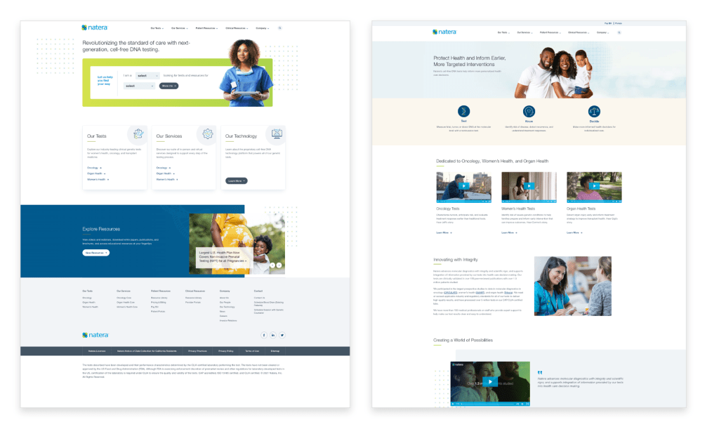 Natera website refresh (left: original site design / right: redesigned site to be patient-focused)