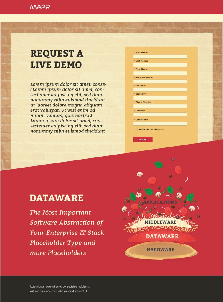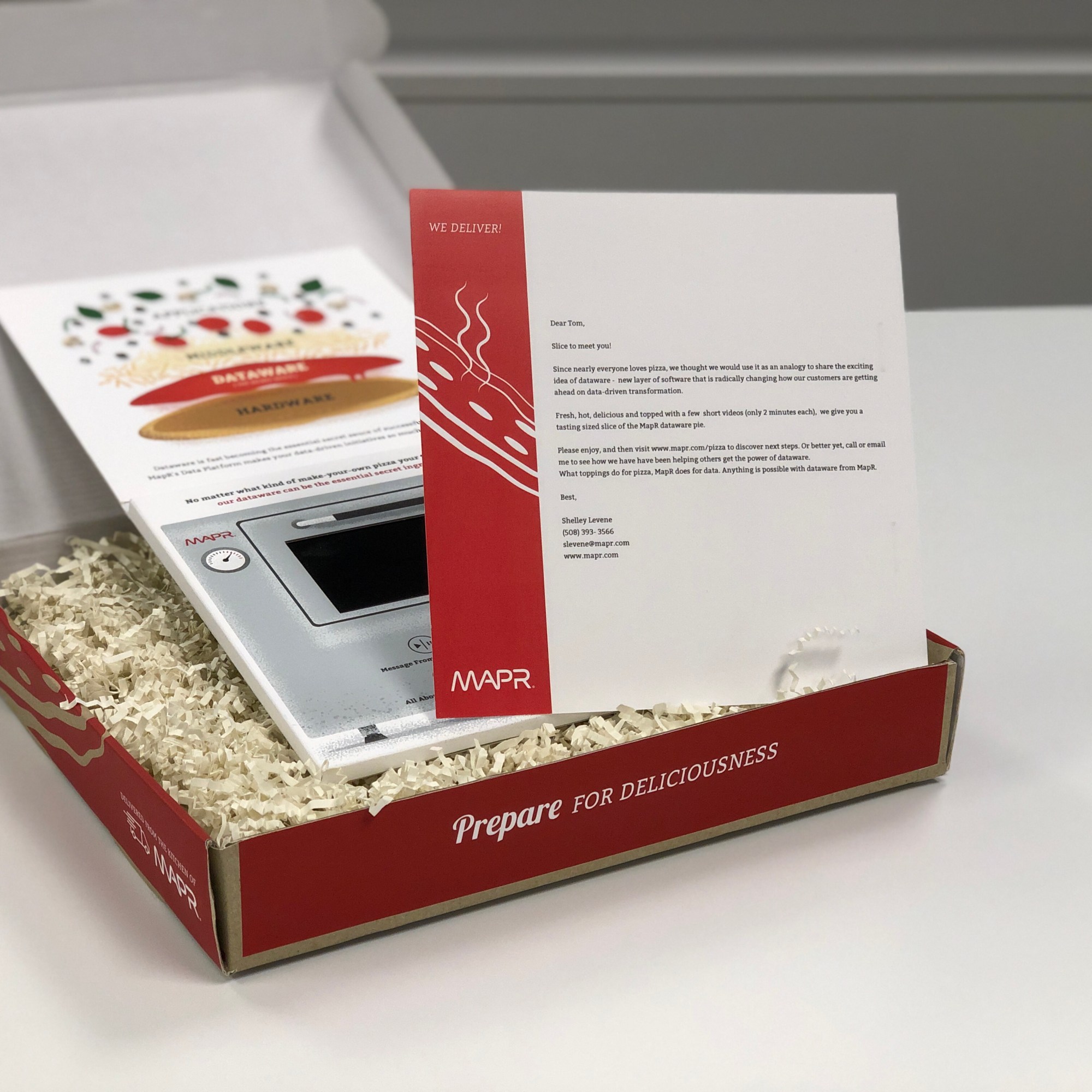 Who doesn’t love pizza?! MapR’s Digital Marketing, Creative, and UI/UX teams joined forces to craft a fun and quirky Account Based Marketing campaign targeting leads from TechTarget. The campaign featured digital ads, targeted Marketo landing pages, Dataware lookbooks, and a physical pizza box for sales reps to deliver to prospects. The pizza box included a personalized letter, a use case, and a video player showcasing MapR Dataware. One of the four videos included is featured below.